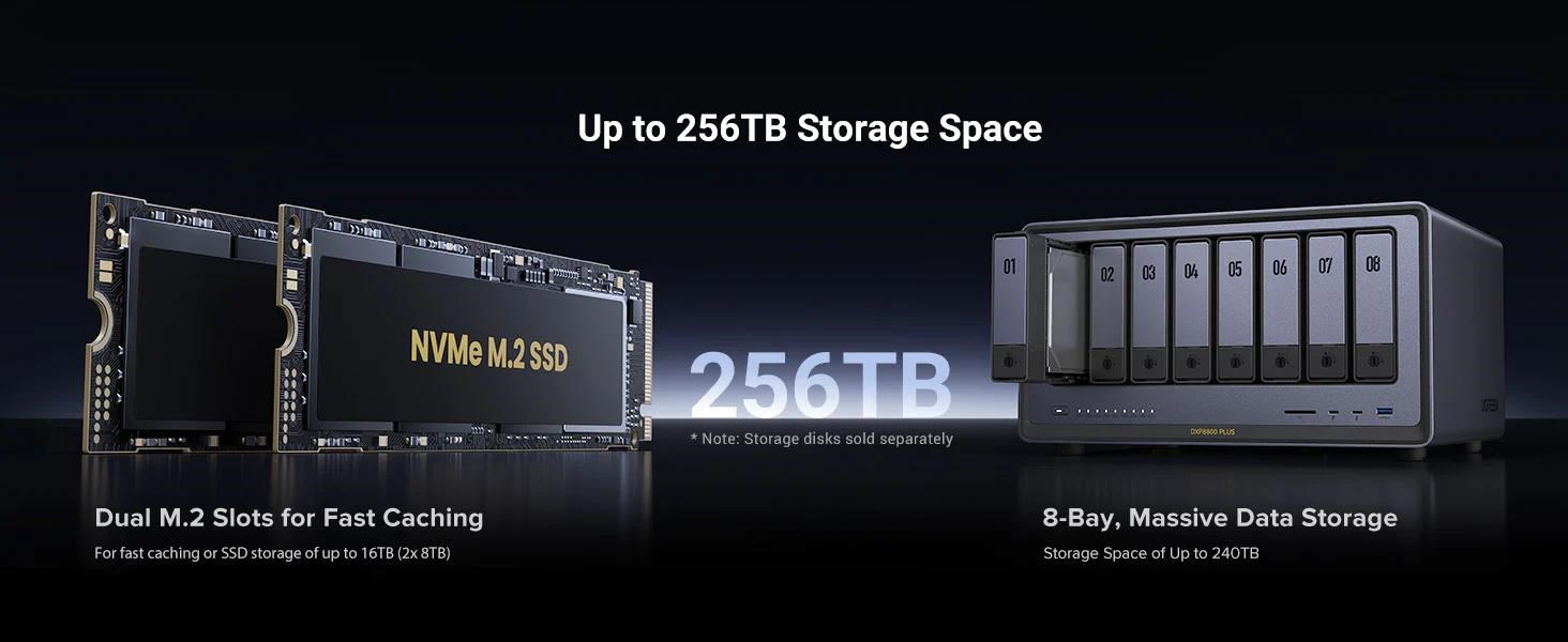 | Maximální kapacita úložiště | 256TB (8x 30TB + 2x 8TB) |