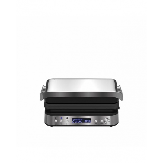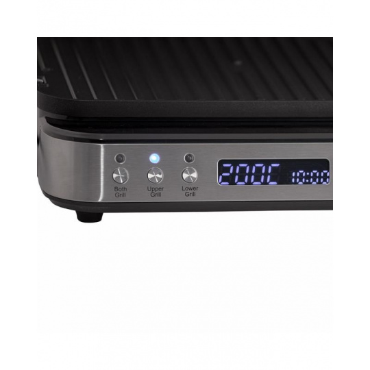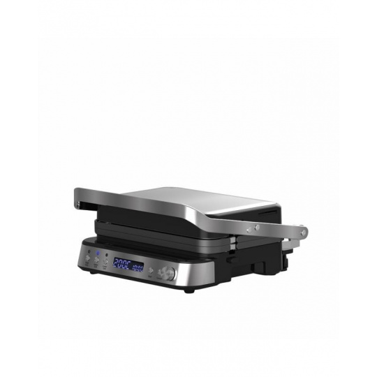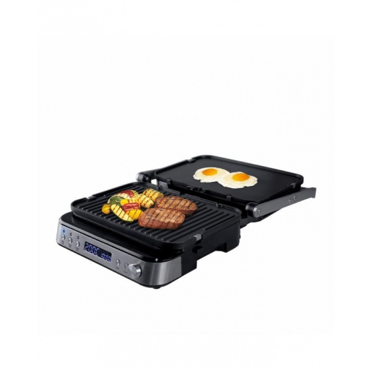 Výkonný elektrický stolní kontaktní gril, Funkce otevřeného i kontaktního grilu, Samostatně regulovatelná teplota (každá plocha samostatně), Kombinace 2 grilovacích ploch (hladký a žebrovaný povrch), Variabilní nastavení teploty 80 až 230 ° C, Grilovací desky s nepřilnavou vrstvou, Časovač s automatickým vypnutím, Velký LCD displej, Zvuková signalizace, Tepelně izolovaná rukojeť, Miska na odkapávání šťávy a oleje, Snadné čištění, odnímatelné grilovací desky, Protiskluzové gumové nožičky pro větší stabilitu, Napájení: 230V ~ 50 Hz, 2 000 W.