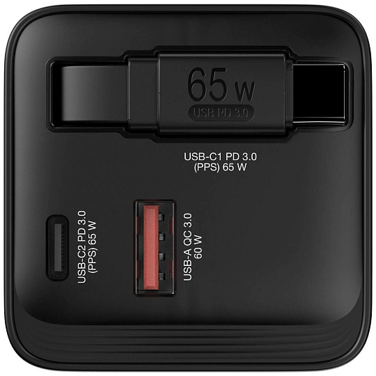 - 65W GaN nástěnná nabíječka se zatahovacím kabelem USB-C® PD 65W a 2 výstupními porty: 1 x USB-C PD 65W a 1 x USB-A QC 3.0