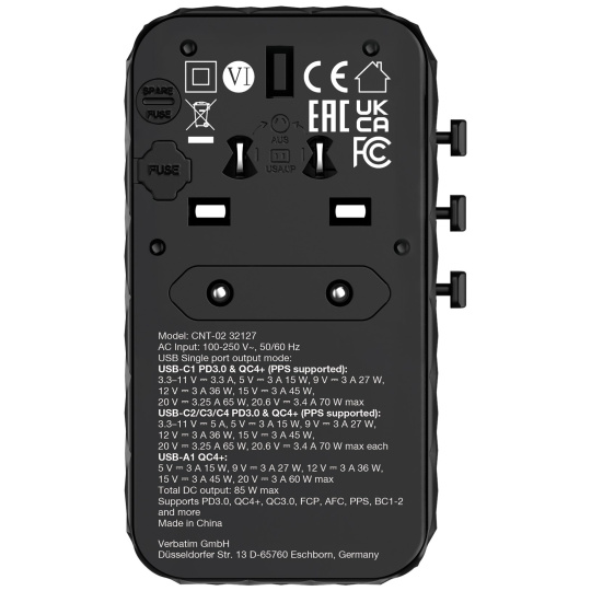 Kompaktní a výkonný univerzální cestovní adaptér Verbatim Charge 'n' Travel GaN III umožňuje nabíjet pět zařízení současně prostřednictvím síťové zásuvky, tří portů USB-C, portu USB-A a výsuvného kabelu USB-C, přičemž nabízí celkový výkon 85 W. Dost na to, abyste mohli bez námahy nabíjet telefony, tablety a další zařízení.