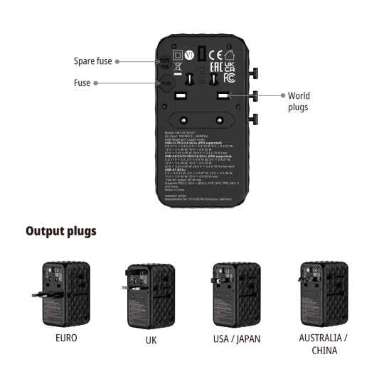 Zapomeňte na přenášení dalších kabelů. Cestovní adaptér obsahuje zatahovací kabel USB-C kompatibilní s většinou zařízení USB-C, díky čemuž budete vždy připraveni, když budete muset cestovat nalehko. Další tři porty USB-C podporují Power Delivery 3.0 (s podporou PPS) a výstup Quick Charge 4+, každý až 70 W, a port USB-A podporuje výstup Quick Charge 4+, až 60 W.