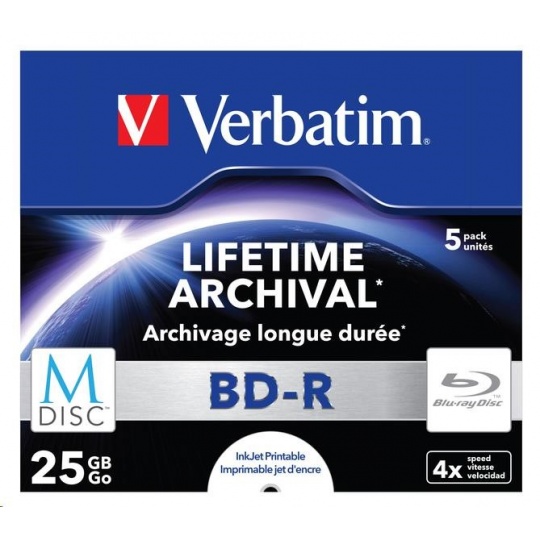 Verbatim M-Disc BD-R Verbatim M-Disc představuje nový standard v oblasti digitálního ukládání, navržený k zachování a ochraně souborů vyrytím informací do patentované vrstvy, která je pevná jako skála a odolná vůči světlu, teplotám i vlhkosti. Testování v souladu s průmyslovým standardem ISO/IEC 10995, které provedla společnost Millenniata, ukazuje, že předpokládaná životnost disků M-Disc DVD je 1 332 roků, přičemž pouhých 5 % disků vykazuje známky ztráty dat po 667 letech. Předpokládaná životnost je tím pádem několik set roků. To znamená, že při ukládání vašich cenných fotografií, hudebních knihoven, lékařských dokumentů nebo jiných údajů máte jistotu, že se vše nachází na disku, který přečká několik generací. Na disk M-Disc BD-R je díky jeho skvělé kompatibilitě možné zapisovat a číst z něj ve všech současných mechanikách Bluray. Parametry: Kapacita: 25 GB Rychlost: 4x Způsob balení: Balení po 5 ks (Jewel Case) Povrch disku: Možnost potisku na inkoustových tiskárnách Oblast tisku: 40 – 118 mm.