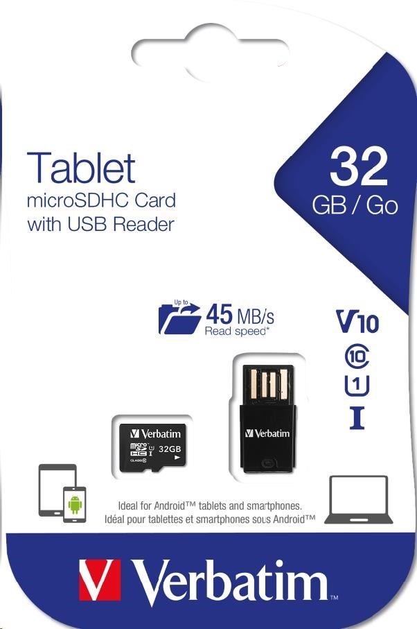 VERBATIM Tablet microSDHC C10/U1 with USB reader 32GB (R:45MB/s, W:10MB/s)