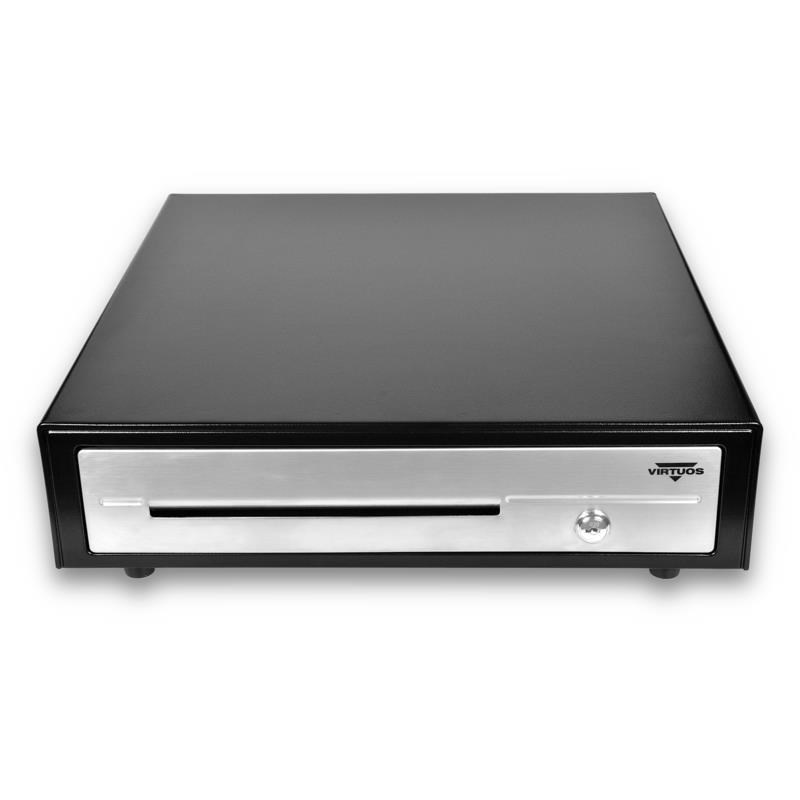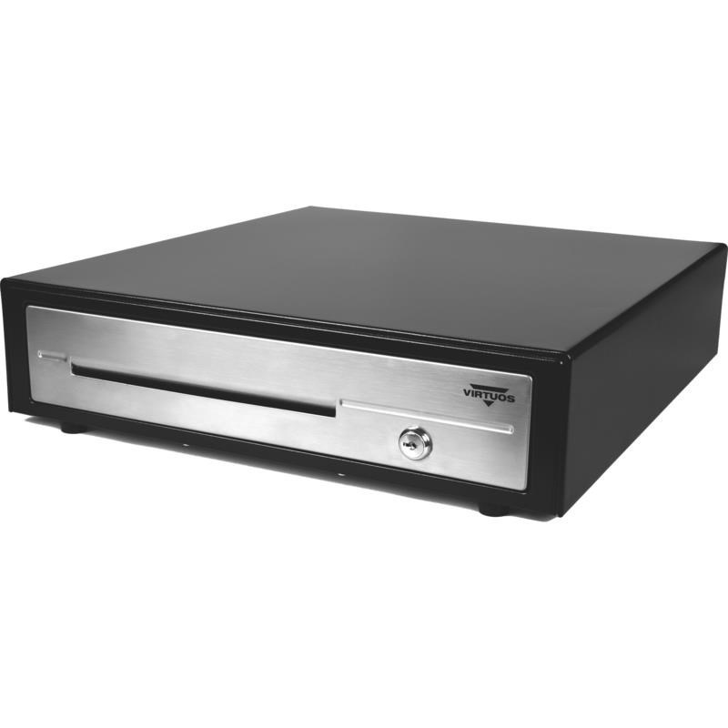 Virtuos pokladní zásuvka C430D - s kabelem, kovové držáky, nerez panel, 9-24V, černá