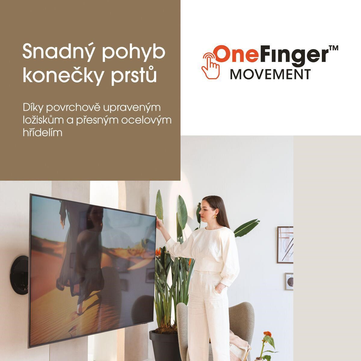 - Snadný pohyb OneFinger™ - díky povrchově upraveným ložiskům a přesným ocelovým hřídelím natočíte TV až o 120 stupňů (platí pro TV do 65").