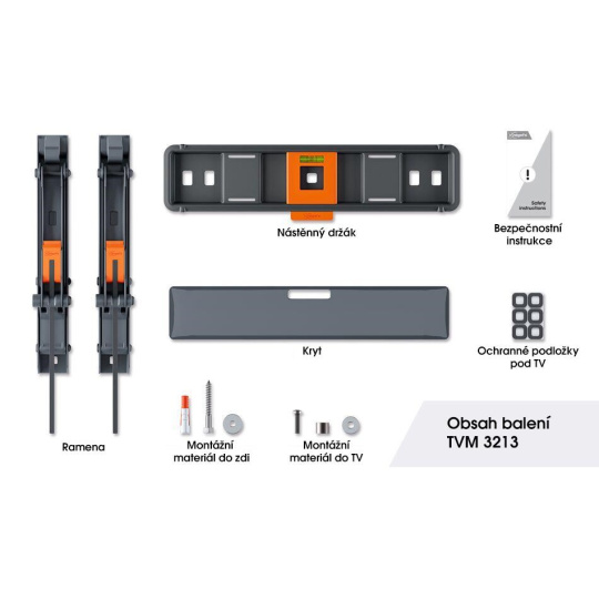 Držák TVM 3213 je vybaven jedinečným bezpečnostním systémem ClickLoc™. Tento systém umožňuje snadné uzamčení nebo uvolnění televizoru z nástěnného držáku. Díky slyšitelnému cvaknutí máte jistotu, že je televizor bezpečně zajištěn na svém místě. Měkké podložky mezi držákem a TV chrání zadní stranu televizoru během jeho montáže před poškrábáním.
