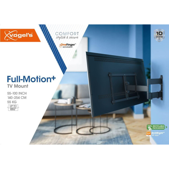 Umístění televizoru do požadovaného pozorovacího úhlu je mimořádně snadné. TVM 3843 je vybaven jedinečnou technologií One-Finger™ Movement společnosti Vogel's. Pohyb s držákem je pak velmi lehký a plynulý. Díky extrémně dlouhým ramenům můžete televizor natočit do velkého úhlu. Maximální úhel natočení pak závisí na šířce konkrétního televizoru.