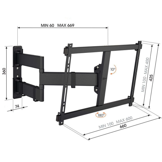 S tímto stylovým nástěnným držákem řady COMFORT Full-Motion+ si můžete sledování svého velkého televizoru maximálně užít. TV 3843 se může otáčet až o 180° a naklánět až o 10° pro optimální pohodlí při sledování. Je navržen pro intenzivní používání, takže je ideální pro rodiny s dětmi. Váš televizor bude zaručeně bezpečně a spolehlivě upevněn. Držák je vhodný pro televizory s úhlopříčkou 50 až 100 palců a hmotností do 55 kg.