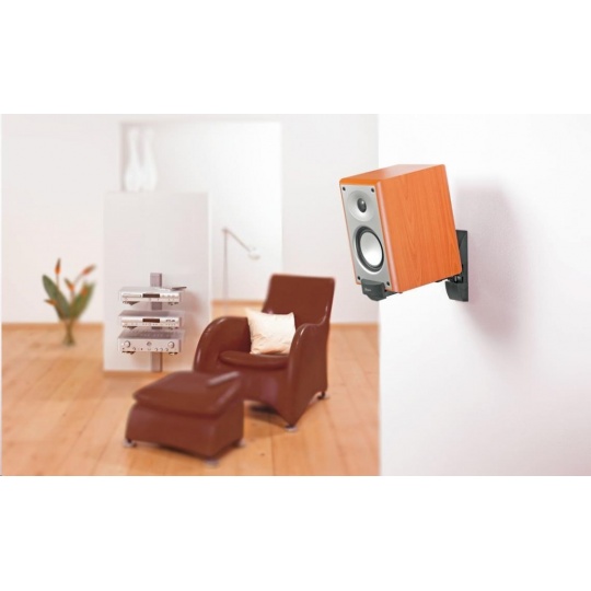 Nástěnný držák bez nutnosti vrtání do skříně reprosoustavy, ta se sevře čelisťovým mechanismem. Ideální pro regálové reprosoustavy střední velikosti