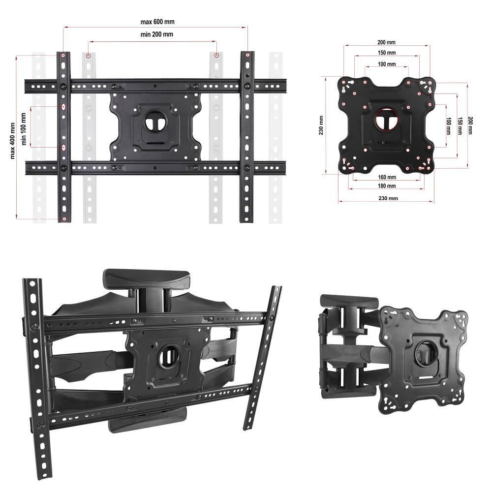 Vysouvací otočný držák na televize Ergosolid K600 Kvalitní držák na Tv 32-70", výsuvný 58-510mm, otočný +/-75°, sklopný +5°/-8°, korekce roviny +/-4°, vedení kabeláže, VESA standard 100x100 až 600x400, nosnost 45,5kg, záruka 5 let, balení obsahuje instalační materiál Nabízíme kvalitní držák na televize v krásném designu za velmi příznivou cenu. Nástěnný držák Ergosolid K600 je výsuvný, nastavíte si vzdálenost od zdi dle vlastní potřeby, televizi můžete otáčet do stran, naklápět, upravit rovinu. Je vhodný pro zavěšení všech typů a značek televizorů s úhlopříčkou 32-70", které podporují některý VESA od 100x100 až do 600x400 a jejichž hmotnost není vyšší jak 45kg. Konstrukce držáku je extrémně pevná a spolehlivá, nedochází k prověšení a ani při častém polohování nevznikají na držáku vůle, nastavení polohy je přitom vždy pohodlné a snadné. Instalace držáku na stěnu je velmi jednuduchá, zvládne ji i laik, instalační materiál je součástí balení. Ramena držáku jsou osazena designovými krytkami, které jsou určeny pro zafixování a skryté vedení kabelů. Barevné provedení černé, záruka 5 let. Vysouvací otočný držák na televize Ergosolid K600 Technické údaje: nosnost 45,5kg podpora VESA standardu 100x100 až 600x400 vhodný pro zavěšení všech typů a značek televizorů doporučená úhlopříčka televizoru 32" až 70" výsuvný - nastavení vzdálenosti od zdi v rozmezí 58-510mm otočný do stran +/- 75° nastavení sklonu Tv +5° až -8° korekce roviny obrazovky +/- 4° extrémně pevná a spolehlivá konstrukce nevznikají vůle ani prověšení i při maximálním zatížení designové krytky ramen držáku pro skryté vedení kabeláže designové kryty nástěnného závěsu pohodlné polohování televize snadná instalace instalační materiál součástí balení barevné provedení černé záruka 5 let Držák s VESA 100x100 až 200x200 a přídavným VESA nástavcem 200x200 až 600x400 na držáku Tv Ergosolid K600 Výsuvný držák Tv Ergosolid K600 podporuje VESA standardy pro zavěšení Tv: VESA 100x100 (bez použití VESA nástavce) VESA 200x100 a 100x200 (bez použití VESA nástavce) VESA 200x200 (bez použití VESA nástavce) VESA 300x200 a 200x300 VESA 300x300 VESA 400x200 a 200x400 VESA 400x300 a 300x400 VESA 400x400 VESA 600x400 Na nástěnný držák Ergosolid K600 můžete zavěsit všechy typy a značky televizorů, jejichž hmotnost nepřesahuje 45kg a které podporují některý z výše uvedených VESA standardů. Velikost televizoru není podstatná, uvedené úhlopříčky jsou pouze informativní..