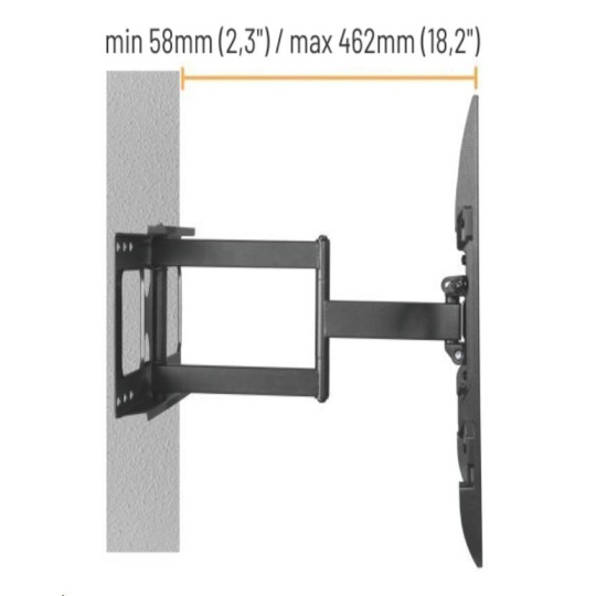 Výsuvný nástěnný držák LPA69-463D je určen pro instalaci TV s plochou obrazovkou s úhlopříčkami od 32“ do 70“. Jeho největší přednostní je robustní výsuvná konstrukce, díky níž unese TV o hmotnosti až 45 kg a zároveň umožňuje nastavit vzdálenost TV od stěny v rozsahu 58 mm až 462 mm, samozřejmostí je pak také velký rozsah polohování. Držák umožňuje snadné naklápění TV v rozsahu +5°~-15°, natočení do stran v rozsahu +90°~-90° a rotaci v rozsahu +3°~-3°, což maximalizuje flexibilitu sledování z libovolného místa v místnosti. Integrovaná svorka na kabely udržuje kabely uspořádané a chráněné.