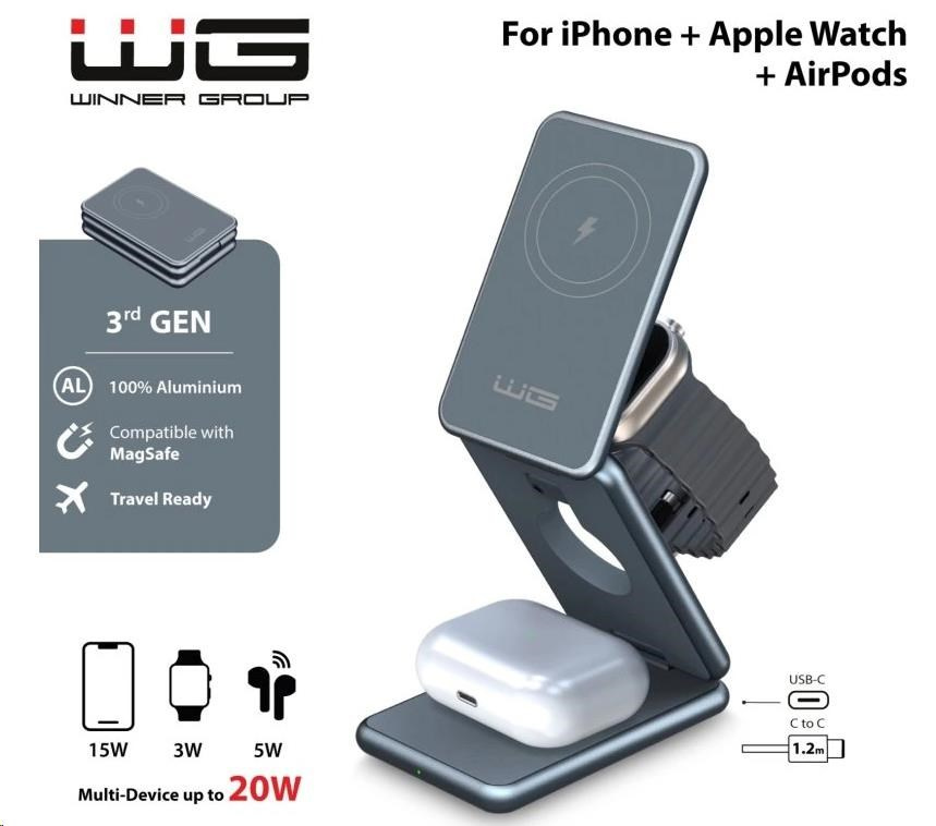 WG - Bezdrátová nabíječka WG39, 3v1, 15W+5W+3W, šedá