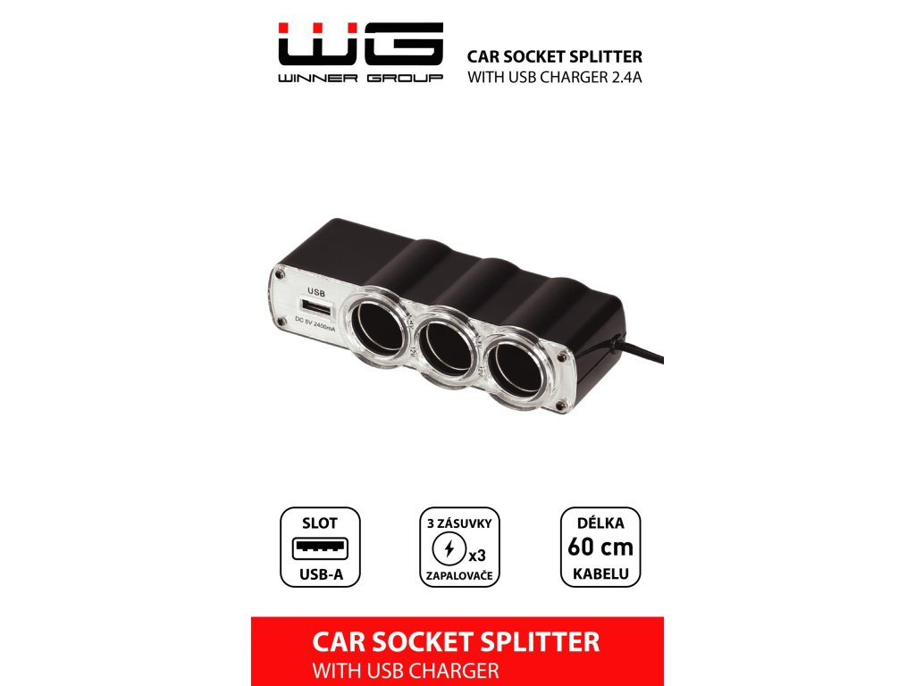 WG - Nabíječka do auta, rozbočovač, 3x zásuvka zapalovače 12V + 1x USB-A, s prodloužením