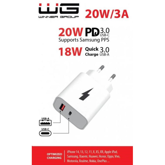 WG - Síťová nabíječka 2x USB, 1x USB-C PD 20W + 1x USB-A QC 3.0 18W, bílá