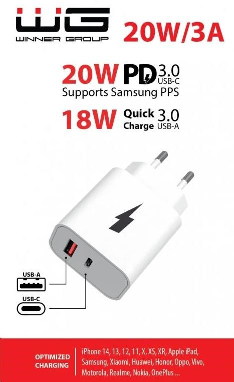 Síťová nabíječka s dvěma USB porty, podporou PD 20W a QC3,0 s výkonem 18W nabízí efektivní nabíjení pro vaše zařízení. Elegantní bílý design nabíječky je ideální pro každodenní použití doma nebo na cestách.