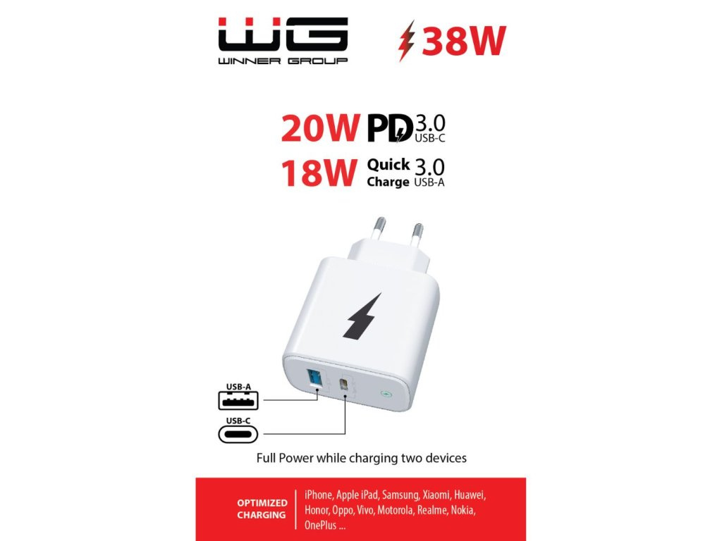 WG - Síťová nabíječka 2x USB 38W, 1x USB-C PD 20W + 1x USB-A QC 3.0 18W, bílá