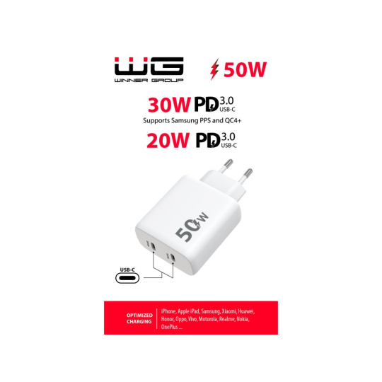 WG - Síťová nabíječka 2x USB-C 50W, 1x USB-C PD 30W + 1x USB-C PD 20W, bílá