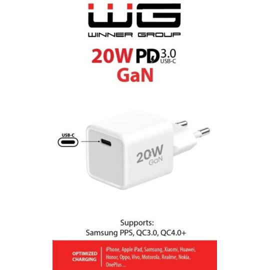 WG - Síťová nabíječka GaN 1x USB-C, PD 20W, 5V-9V-12V, bílá