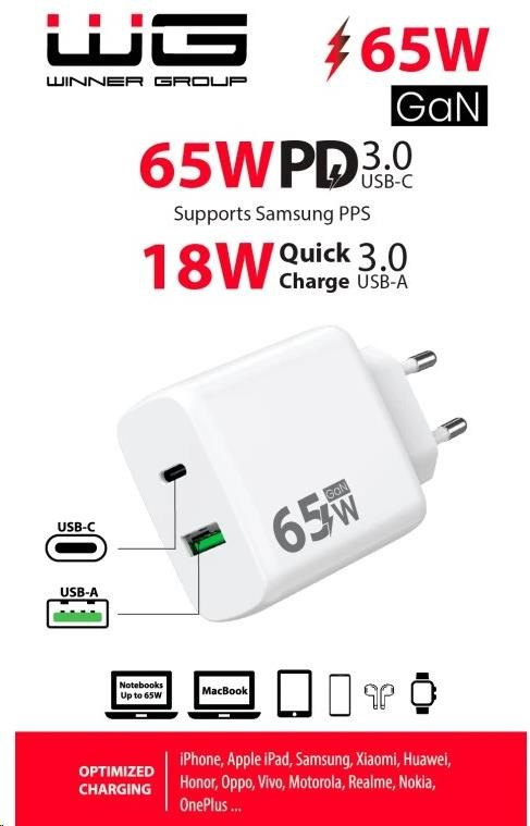 WG - Síťová nabíječka GaN 2x USB 65W, 1x USB-C PD 65W + 1x USB-A QC3.0 18W, white