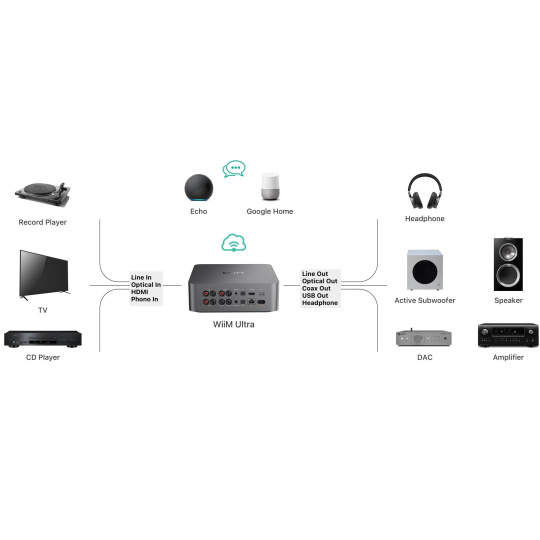 WiiM Ultra disponuje gramofonovým předzesilovačem, tím lze jednoduše připojit gramofon osazený MM/MC přenoskou. Předzesilovač Ultra pomůže nastavit akustickou korekci místnosti pomocí iOS telefonů a tím vylepšit výkon připojených reproduktorů a subwooferu. Subwooferový výstup umožní připojení subwooferu v kombinaci s integrovaným nebo koncovým zesilovačem bez subwoferového výstupu. Navíc díky vestavěnému EQ si lze upravit nízké frekvence dle vašich preferencí. Osazení HDMI ARC vstup umožňuje pohodlně připojit chytrou TV pro co nejjednodušší ovládání hlasitosti. Skrze HDMI lze do předzesilovače posílat Dolby Digital zvuk, díky kvalitnímu integrovanému D/A převodníku dosáhnete skvělého zvuku z TV.