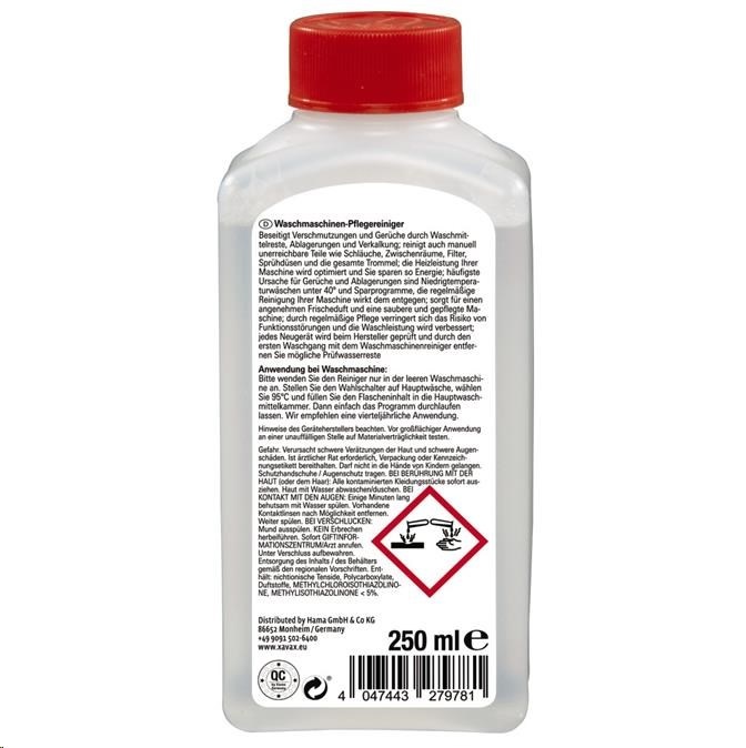 - odstraňuje nečistoty a nepříjemný zápach způsobený zbytky vodního kamene a pracích prostředků - nepříjemný zápach a usazeniny vznikají především kvůli nízké teplotě při praní (prací programy s teplotou nižší než 40°C) a úsporným programem; pravidelné čištění tomu zabraňuje - čistí i nedostupné časti pračky (výhřevná tělesa, hadice, mezery, těsnění, filtry, trysky a celý prací buben) - optimalizuje ohřívací výkon a šetří energii - pravidelné čištění snižuje riziko poškození pračky a zlepšuje prací výkon - bezpečnostní uzávěr - objem: 250 ml Informace pro spotřebitele: Použití Prostředek používejte pouze v prázdné pračce bez prádla, pracích prostředků. Obsah lahve nalejte do zásobníku na prací prostředek pro hlavní praní. Spusťte hlavní program při teplotě 95° a vyčkejte, dokud pračka nedokončí celý program.