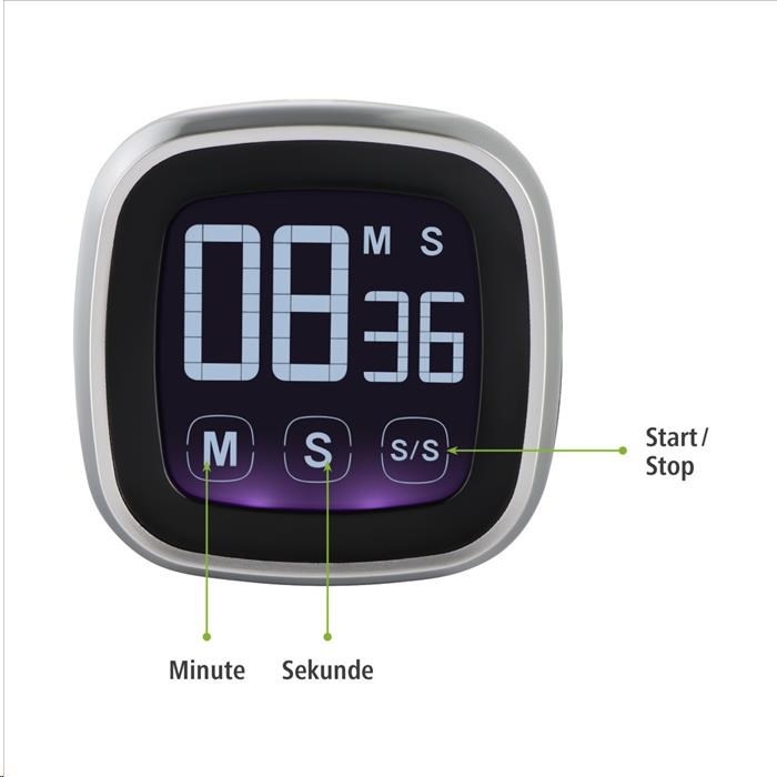 - digitální minutka se stylovým designem - nastavení času pomocí 3 dotykových tlačítek (až do 99 minut a 59 sekund) - funkce stopek a odpočítávání - tlačítko Start / Stop - hlasitý zvukový signál - velký 4-číslicový displej (XX: XX) - podsvícení - možnost postavení na vodorovnou plochu pomocí stojánku nebo připevnění na kovové magnetické povrchy pomocí magnetu - rozměry (V x D x Š): 7,2 x 7,2 x 2,4 cm - napájení: 2x Micro AAA (součást balení) - barva: černá/ stříbrná.
