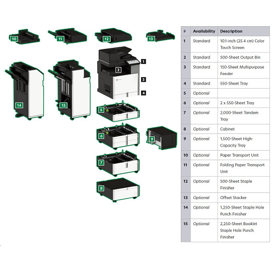 .Part Number 20L8200 Print Technology Color Laser Function Color Copying Color Faxing Color Printing Color Scanning Trusted Platform Module (TPM) The Trusted Platform Module (TPM) is not available in some countries. Workgroup Size Large Workgroup Touch Screen Display Yes Display Lexmark e-Task 10-inch (25 cm) class color touch screen Print Speed (Letter, Black) Up to 35 ppm4 Print Speed (Letter, Color) Up to 35 ppm4 Print Speed (Letter, Black) Duplex Up to 35 spm4 Print Speed (Letter, Color) Duplex Up to 35 spm4 Time to First Page (Black) As fast as 7.1 seconds Time to First Page (Color) As fast as 8.2 seconds Duplex (2-sided) Printing Integrated Duplex Print Resolution, Black 1200 x 1200 dpi 4800 Color Quality Print Resolution, Color 1200 x 1200 dpi 4800 Color Quality Copy Speed (Letter, Black) Up to 35 cpm4 Copy Speed (Letter, Color) Up to 35 cpm4 Copy Speed (Letter, Black) Duplex Up to 35 spm4 Copy Speed (Letter, Color) Duplex Up to 35 spm4 Time to First Copy (Black) As fast as 8.5 seconds Time to First Copy (Color) As fast as 9.5 seconds Reduce / Enlarge Range 25 - 400 % A4/Ltr Simplex Scan Speed (Black) Up to 120/120 sides per minute A4/Ltr Simplex Scan Speed (Color) Up to 120/120 sides per minute A4/Ltr Duplex Scan Speed (Black) Up to 240/240 sides per minute A4/Ltr Duplex Scan Speed (Color) Up to 240/240 sides per minute Scan Area, Maximum 11.69 x 17.0 inches ADF Scan DADF (single pass Duplex) Scanner Type Flatbed scanner with automatic document feeder Scan Resolution, Enhanced 600 x 600 dpi Scan Resolution, Optical 300 x 300 dpi Optical Scanning Resolution 300 X 300 dpi Scan File Formats (Send as) JPEG, JPG PDF Secure PDF TIFF Archival PDF (A-1a, A-1b) Searchable PDF TXT RTF DOCX Scan Destinations e-mail FTP USB Flash drive USB or Network connected computer Processor Speed Quad Core, 1.2 GHz Memory, Standard 4 GB Memory, Maximum 4 GB Hard Disk Intelligent Storage Drive included; Magnetic Hard Disk available Apple Operating Systems Supported Support is provided through AirPrint and AirScan only Citrix MetaFrame Microsoft Windows Server 2012 R2 Datacenter Edition running Citrix XenApp 7.5, 6, 7, 8, 9, 11, 12, 13, 14, 15, 16 Microsoft Windows Server 2012 Datacenter Edition running Citrix XenApp 7.5, 6, 7, 8, 9, 11, 12, 13, 14, 15, 16 Microsoft Windows Server 2012 Foundation running Citrix XenApp 6.0, 6.5 Microsoft Windows Server 2012 Essentials running Citrix XenApp 6.0, 6.5 Microsoft Windows Server 2012 Standard running Citrix XenApp 6.0, 6.5 Linux Operating Systems Supported Ubuntu 20.04 Debian 10 SUSE Linux Enterprise Server 12 SP5 OpenSUSE 15.2 Debian 11 Ubuntu 22.04 Fedora 36 Fedora 37 SUSE Linux Enterprise Server 15 SP4 OpenSUSE 15.4 Red Hat Linux 8.7 Red Hat Linux 9.1 Microsoft Windows Operating Systems Supported Windows Vista Windows Vista x64 Windows Server 2008 Windows Server 2008 x64 Windows Server 2008 running Terminal Services Windows Server 2008 x64 running Terminal Services Windows 7 Windows 7 x64 Windows Server 2008 R2 Windows Server 2008 R2 running Terminal Services Windows 8 Windows 8 x64 Windows Server 2012 Windows 8.1 Windows Server 2012 R2 Windows 10 Windows Server 2016 Windows Server 2019 Windows Server 2022 Windows 11 Novell Operating Systems Supported Novell NetWare 6.5 Open Enterprise Server Novell Open Enterprise Server 2 (SP3) on SuSE Linux Enterprise Server 10 SP4 (x86 and x64) 3 Novell Open Enterprise Server 11 (SP3) on SuSE Linux Enterprise Server 11 SP4 (x86 and x64) Novell Open Enterprise Server 11 (SP3) on SuSE Linux Enterprise Server 12 SP1 (x86 and x64) Novell Open Enterprise Server 15 (SP1) on SuSE Linux Enterprise Server 11 SP4 (x86 and x64) Other Operating Systems Supported Virtually any platform supporting TCP/IP Included Paper Handling 550-Sheet Tray 150-Sheet Multipurpose Feeder 500-Sheet Output Bin Optional Paper Handling 550-Sheet Tray Offset Stacker 500-Sheet Staple Offset Finisher 2 x 550-Sheet Tray 2000-Sheet Tandem Tray Cabinet 1,500-Sheet High-Capacity Tray Paper Transport Unit Folding Paper Transport Unit 1,250-Sheet Staple Hole Punch Finisher 2,250-Sheet Booklet Staple Hole Punch Finisher Paper Input Capacity, Standard Up to 700 pages 20 lb or 75 gsm bond Paper Input Capacity, Maximum Up to 4750 pages 20 lb or 75 gsm bond Paper Output Capacity, Standard Up to 500 pages 20 lb or 75 gsm bond Paper Output Capacity, Maximum Up to 2650 pages 20 lb or 75 gsm bond Paper Weight Range Supported - Standard Tray (lb.) 16 - 80 lb. Paper Weight Range Supported - Multipurpose Feeder (lb.) 16 - 80 lb. A3 / 11 x 17 Yes ADF 300-Sheet Automatic Document Feeder ADF Paper Input Capacity Up to 300 pages 20 lb or 75 gsm bond ADF Paper Output Capacity Up to 300 pages 20 lb or 75 gsm bond Finishing Option Yes Finishing Functions Offset stacking Stapling Hole punching Number of Paper Inputs, Standard 2 Number of Paper Inputs, Maximum 6 Media Types Supported Card Stock Envelopes Glossy Paper Labels Plain Paper Vinyl Labels Refer to the Paper & Specialty Media Guide Media Sizes Supported 10 Envelope 7 3/4 Envelope 9 Envelope A3 A4 A5 B5 Envelope C4 Envelope C5 Envelope DL Envelope Hagaki Card Executive Folio JIS-B4 JIS-B5 Ledger Legal Letter Statement Oficio A6 SRA3 Standard Ports USB 2.0 Specification Hi-Speed Certified (Type B) Gigabit Ethernet (10/100/1000) Front USB 2.0 Specification Hi-Speed Certified port (Type A) 802.11a/b/g/n/ac + Apple iBeacon Optional Local Ports Internal RS-232C serial Internal 1284-B Bidirectional Parallel Optional Network Ports MarkNet N8230 Fiber Ethernet Print Server Direct USB Yes Ethernet Network Yes Wireless Yes Wireless Network WPA2™ - Personal WPA™ and WPA2™ - Personal 802.1x Authentication: MD5, MSCHAPv2, LEAP, PEAP, TLS, TTLS Network Protocol Support TCP UDP IPSEC w/ IPv4 IPSEC w/ IPv6 ICMP IGMP IPv4 IPv6 Network Printing Methods Direct IP (Port 9100) Enhanced IP (Port 9400) FTP IPP 1.0, 1.1, 2.0 (Internet Printing Protocol) Microsoft Web Services WSD Pull Printing Thin Print LPR Network Management Protocols WINS AP