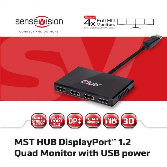 Rozbočovače Club 3D SenseVision MST využívají technologii Multi Stream Transport, jedinečnou funkci DisplayPort ™ 1.2, která umožňuje přenášet více nezávislých nekomprimovaných video (a audio) toků na jediném kabelu. To umožňuje použití více monitorů připojených pomocí rozbočovače MST. Rozbočovače Club3D MST jsou schopny distribuovat tyto video toky na připojené obrazovky.