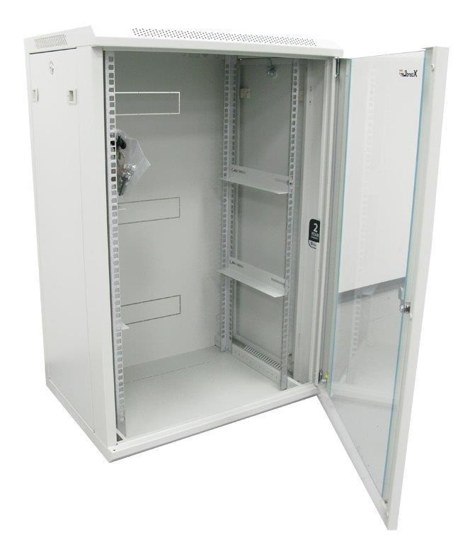 XtendLan 19" nástěnný rozvaděč 22U 600x600, nosnost 60 kg, skleněné kouřové dveře, svařovaný, šedý