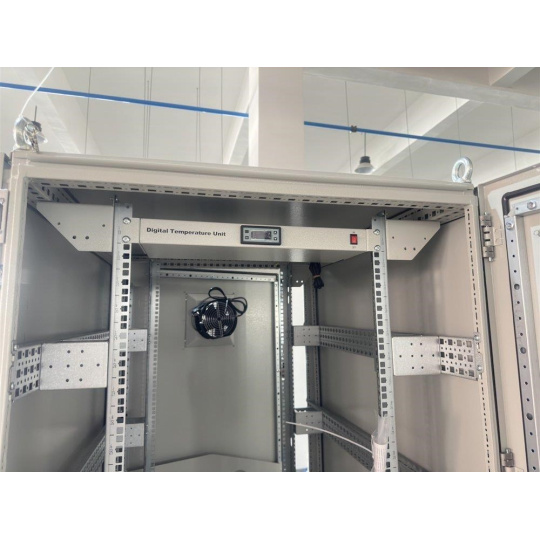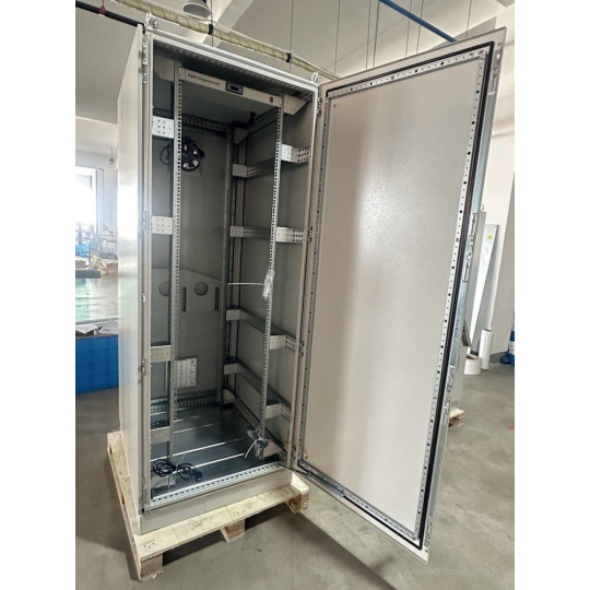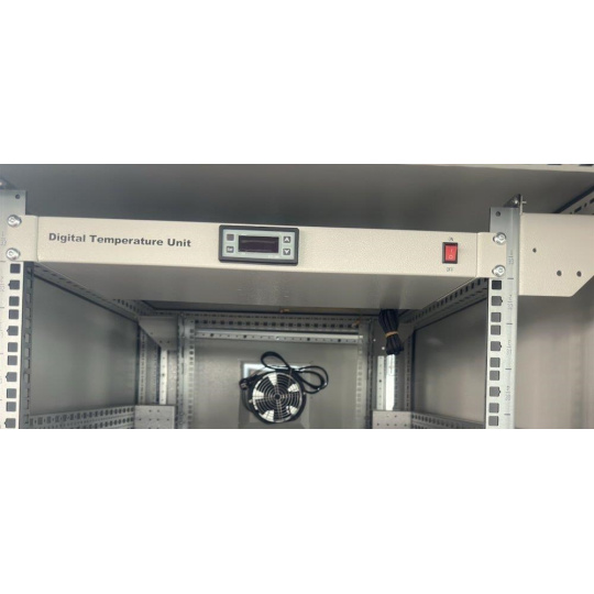 Rozvaděč pro instalaci datových a telekomunikačních zařízení, ventilace s termostatem, podstavec, šedý.