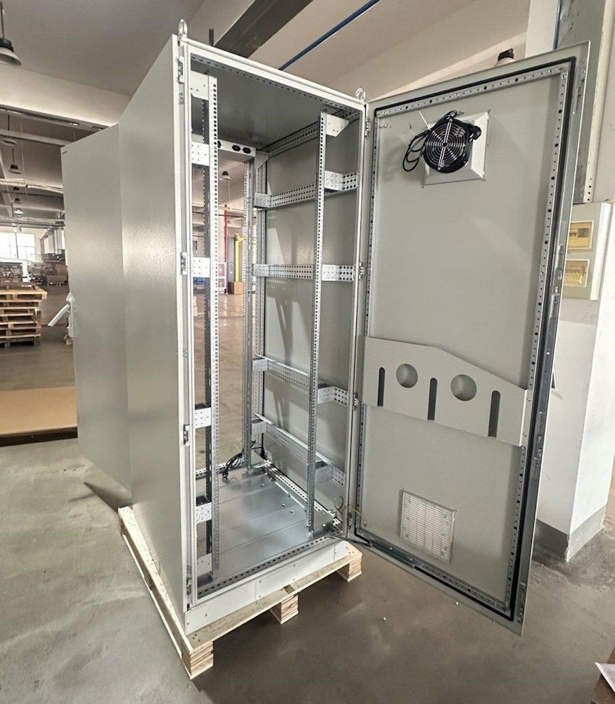 Rozvaděč pro instalaci datových a telekomunikačních zařízení, ventilace s termostatem, podstavec, šedý.