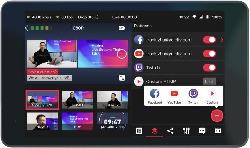 YoloBox Pro je video přepínač, kodér, monitor, rekordér a audio mixer v jednom. Díky vestavěné službě restreaming se nativní podpora integruje přímo s YouTube, Facebook a Twitch. Můžete se jednoduše přihlásit ke svému účtu na sociálních sítích a začít streamovat. V nabídce můžete přidat grafické prvky, jako jsou loga, obraz v obraze, výsledkovou tabulku a rolovací titulky, také komentáře ke streamu, zobrazení vedle sebe, rozdělené zobrazení a mnoho dalšího. Můžete snadno komunikovat se svým publikem v reálném čase díky překrývání komentářů a přizpůsobeným možnostem obrazu v obraze, včetně režimu rozhovoru, upravitelných vestavěných šablon a možnosti nahrát vlastní šablony, čímž přizpůsobíte a vnesete do vašeho streamu vaše vlastní nápady a osobnost.